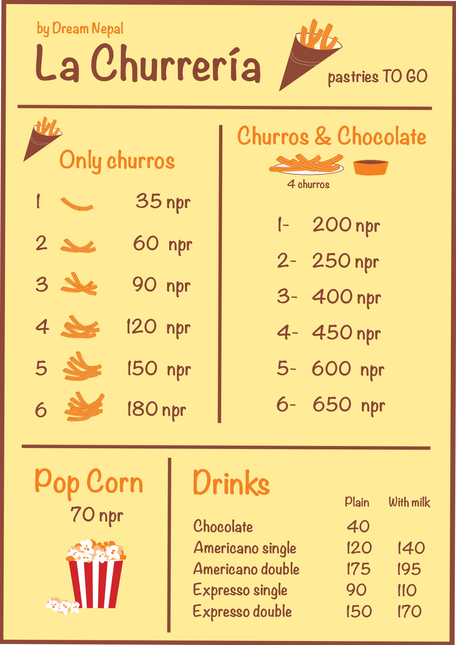 La Churrería vende churros solos o con chocolate, café, té y palomitas de maíz. En ella trabajan tres jóvenes, en este caso pertenecientes a las organizaciones amigas Camina Nepal, The Kumari Project y ABA Nepal.